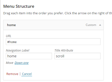 Step 2 – Each menu item you add needs a unique anchor name in the URL field. These names act as anchors, and will link to the corresponding anchor name in your page content. Use the “Links” box on the left hand side to add menu items. In the “URL” field type the anchor of your section, ex: #intro and then assign a name to the menu item. Click the “Add to Menu” button.